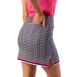 The black and white maze-like print on Ebb and Flow is featured on a classic pull-on skort. This golf skort has a hot pink grosgrain ribbon on the back pocket and is engineered with matching stripes on the bottom. The 17” length, 3” contoured waistband and with built-in, loose-fitting matching shorts underneath extend the comfort for longer.
