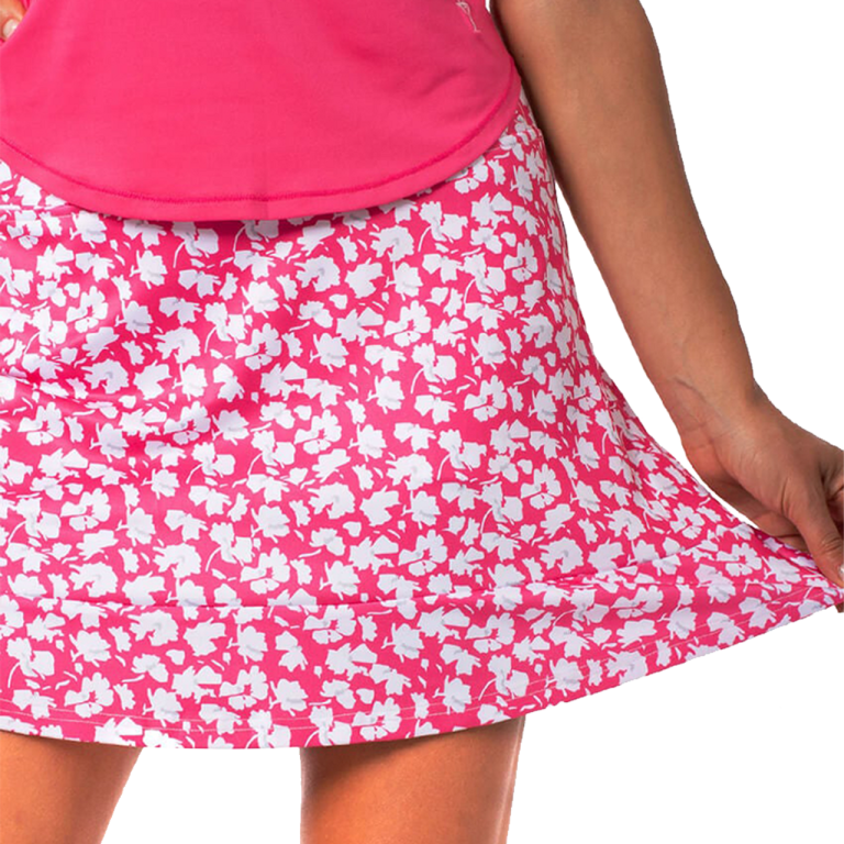 This pretty floral print is available in our best-selling pull-on ruffle design. A shorter 16.5” length with 3” contoured waistband and a touch of ruffle and all the necessities for a round of golf or a day on-the-run. Wrinkle free construction with a loose fitting short underneath will extend your comfort for longer. A hidden front tee pocket and back scorecard pocket provide room for the course necessities.