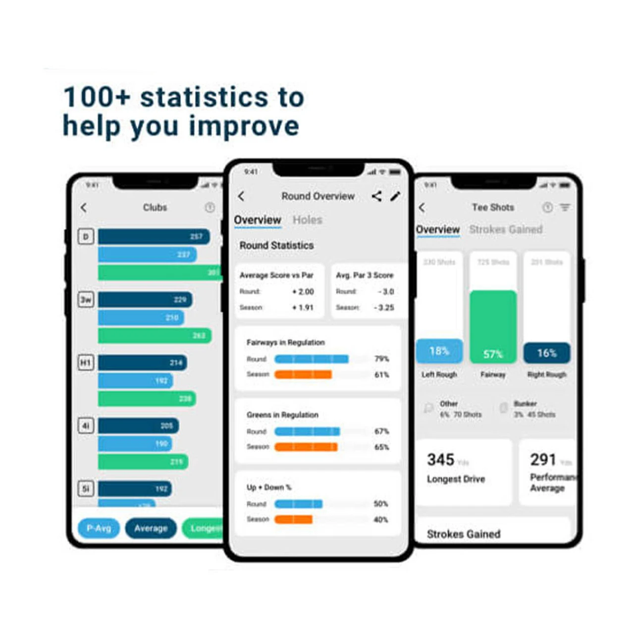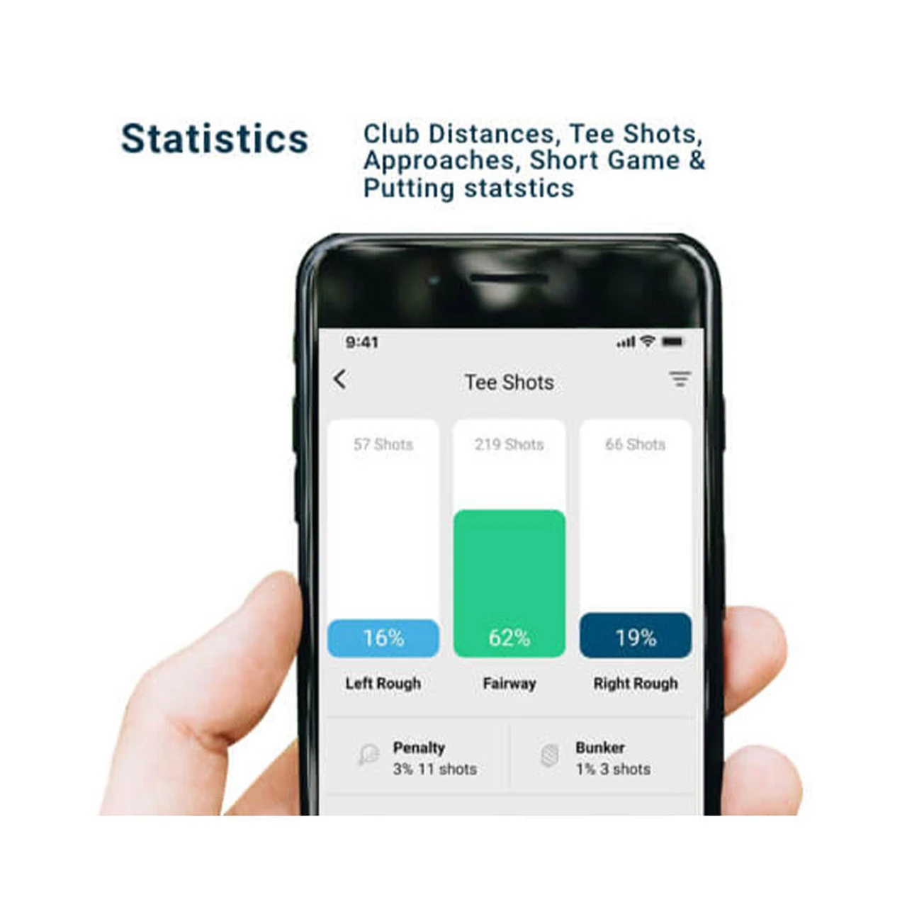 - Stats on tee shots, approaches, short game, putting and scoring