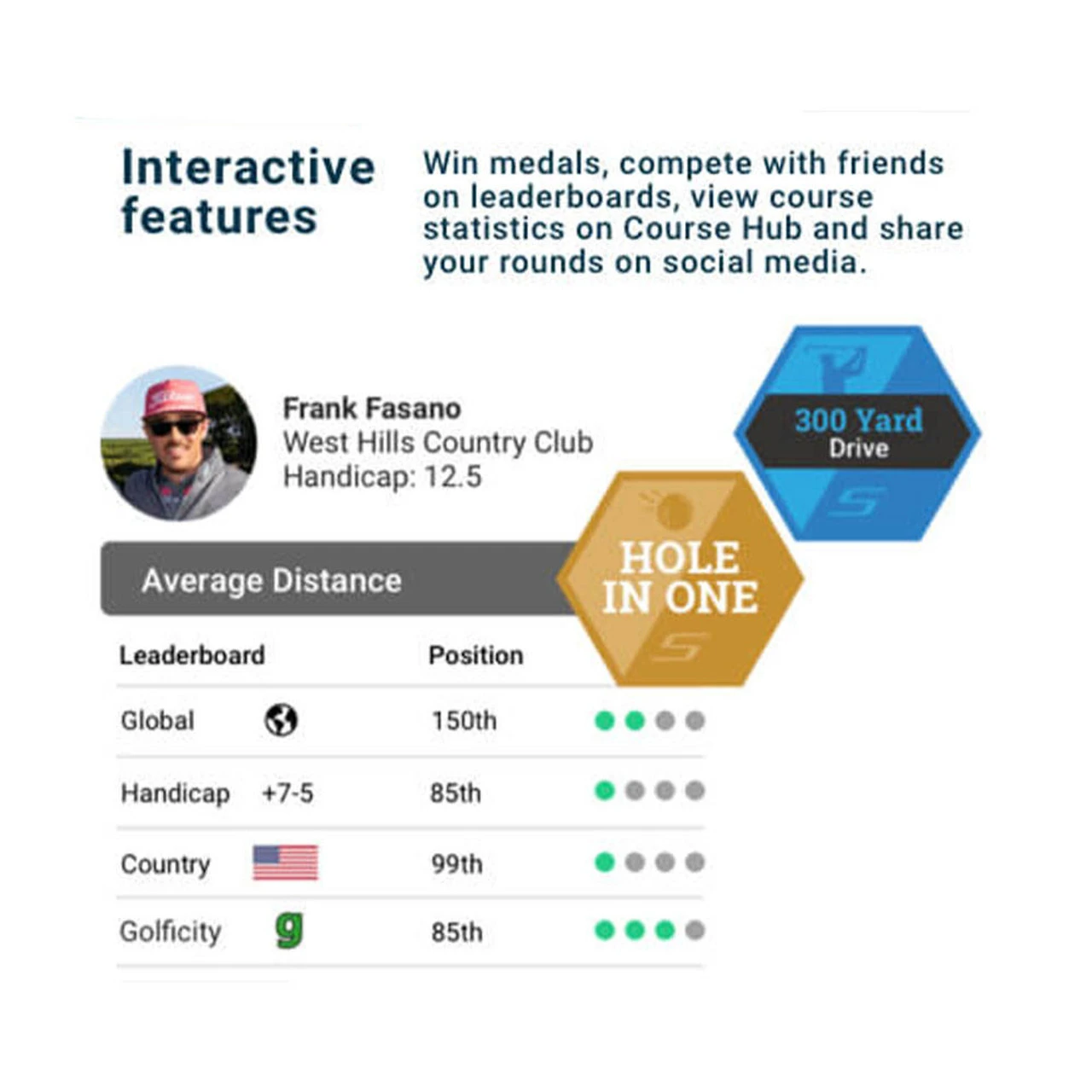 Stat Tracking Mobile App and Web Dashboard PinCollect technology provides exact pin location for enhanced approaches, short game and putting statistics, Virtually join any club in the world on Course Hub to view how Shot Scope users play that course, Interactive features like medals, leader boards and course hub, Social share feature, share good rounds or highlights with friends, 48 hour course edits in house, Free firmware updates for new features and improvements. For golfers of all skill levels, the free (no subscription required) Shot Scope mobile app allows the golfer to analyze their performance statistics in as much detail as they would like.