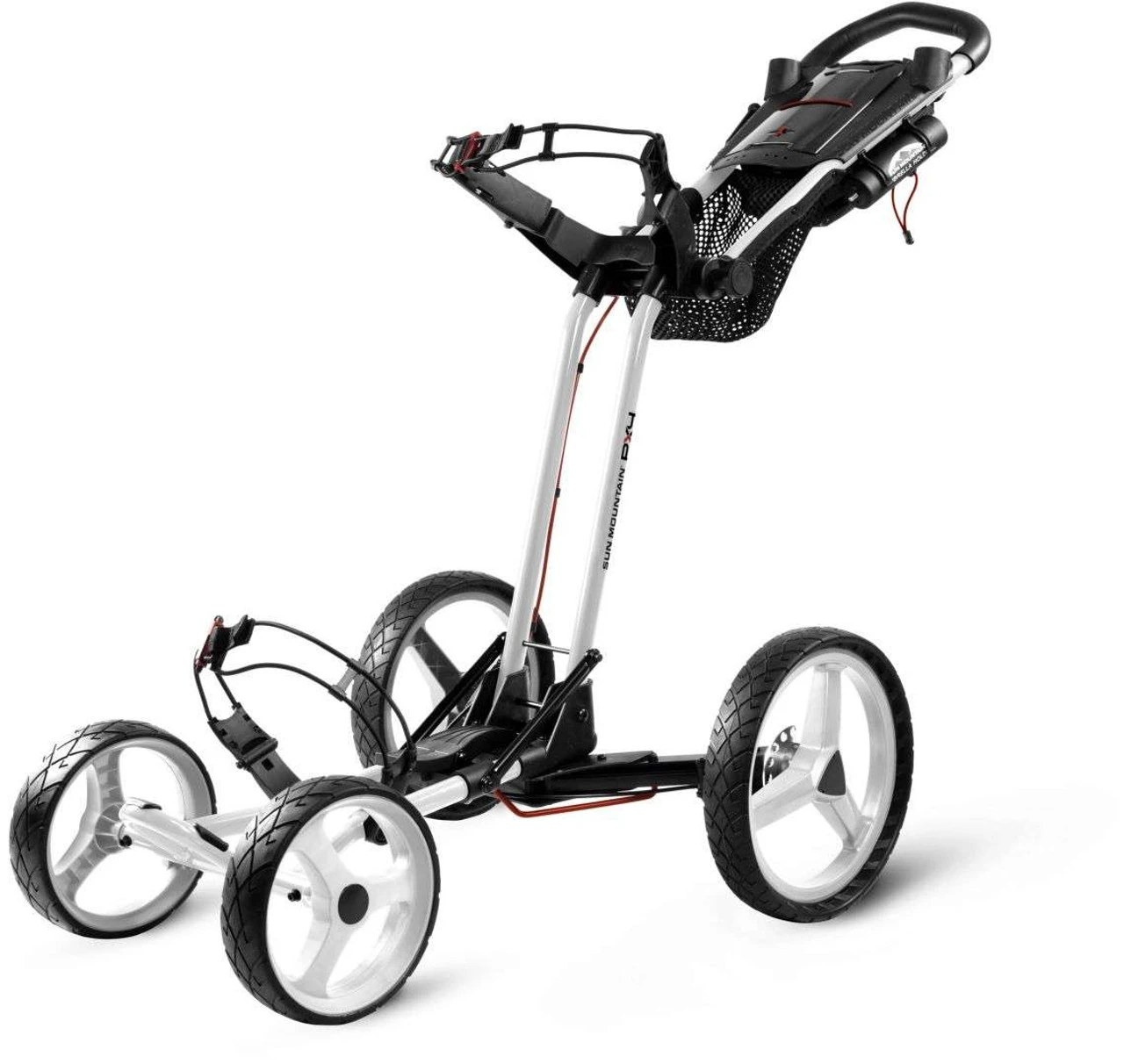 The Sun Mountain PX4 Push cart folds in two easy steps into a small blueprint that fits into nearly any vehicle. The best in on course convenience, the accessory console is designed to hold your phone, scorecard, extra balls and tees. Additional storage is available in the mesh basket and velour-lined valuables pouch for your rangefinder or other important accessories. The PX3 is also equipped with dual umbrella holders, a cup holder, adjustable bungee straps and a continuous handle for easy push and pull.