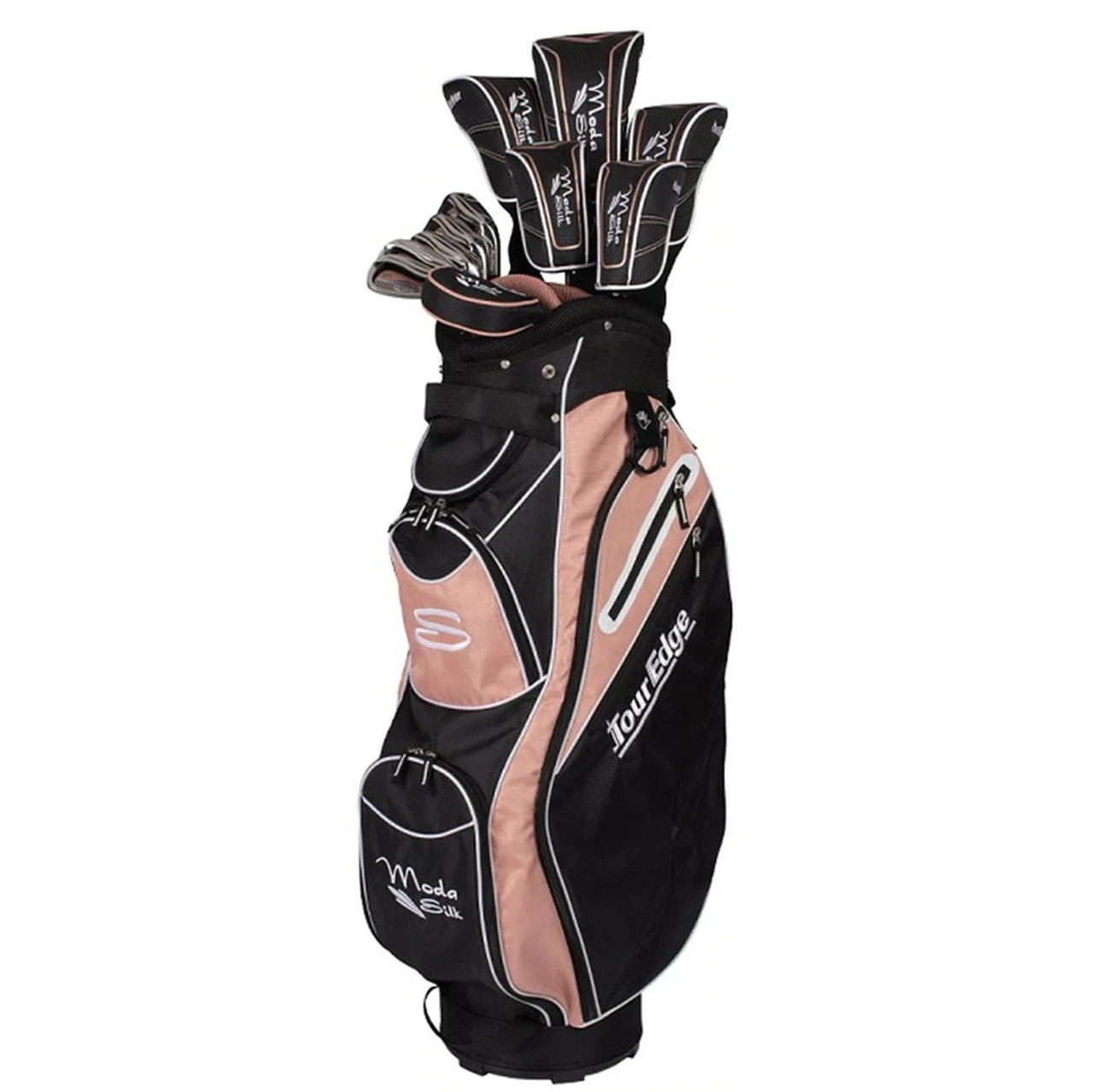 The same company that gives you high-end materials and performance in their Exotics line, Tour Edge, now offers you the same time and commitment to a package set with the Moda Silk. The perfect beginner’s set for women, the Moda Silk gives you everything you need to start and enjoy the game, without the guesswork. Along with the matching premium cart bag and covers, their are 11 clubs in all. The driver is oversize at 460cc and has 15° of loft to increase launch and deliver higher, longer drives. The 3 and 5 woods are offset with a low-profile design. The low center of gravity helps get the ball in the air from any lie. 5 and 6 hybrids replace tough to hit long irons and provide plenty of forgiveness. The 7 iron thru sand wedge are oversized with a perimter-weighted undercut cavity for ultimate forgiveness. A high MOI mallet-style putter is easier to line up and aids in accuracy.